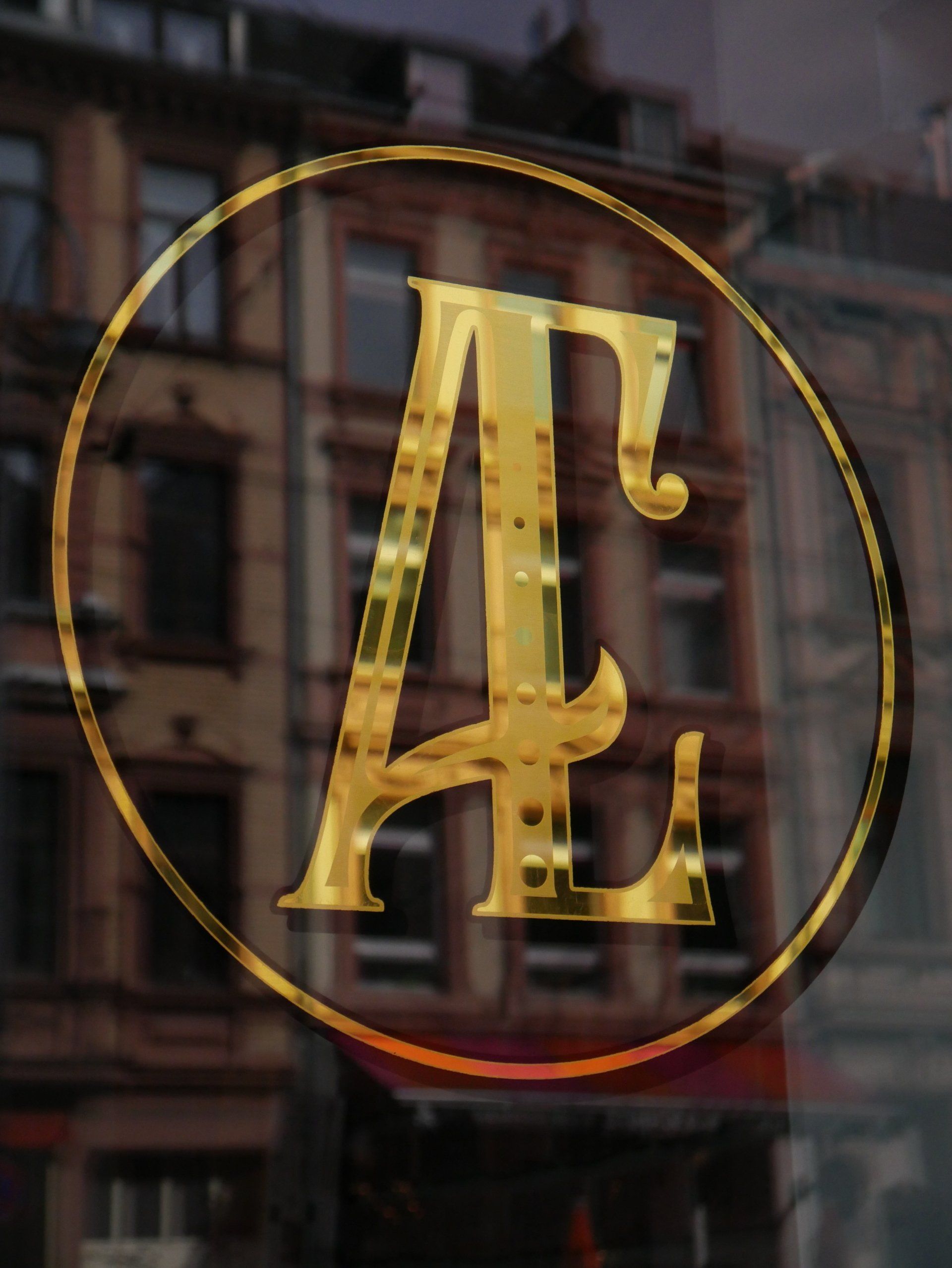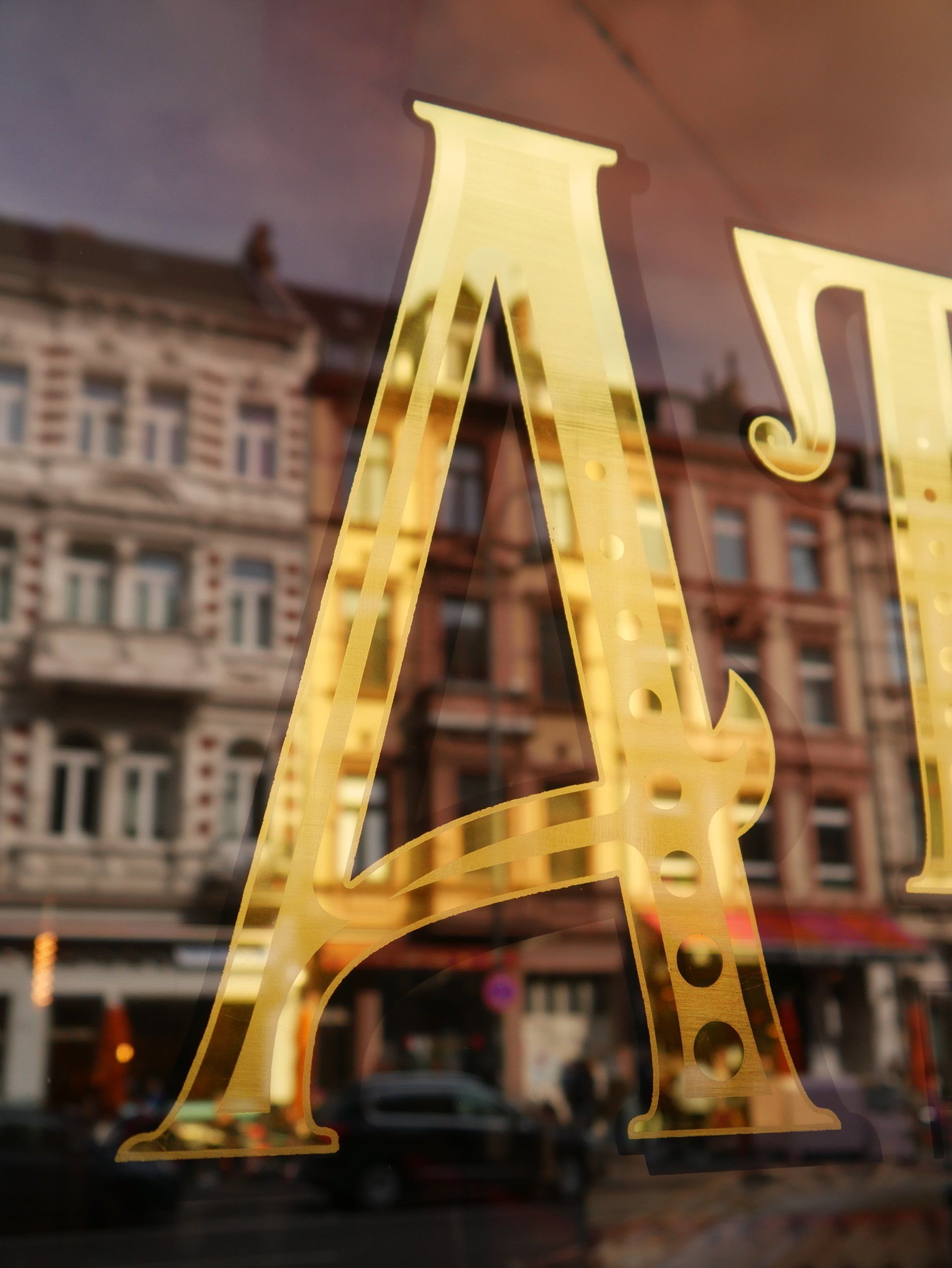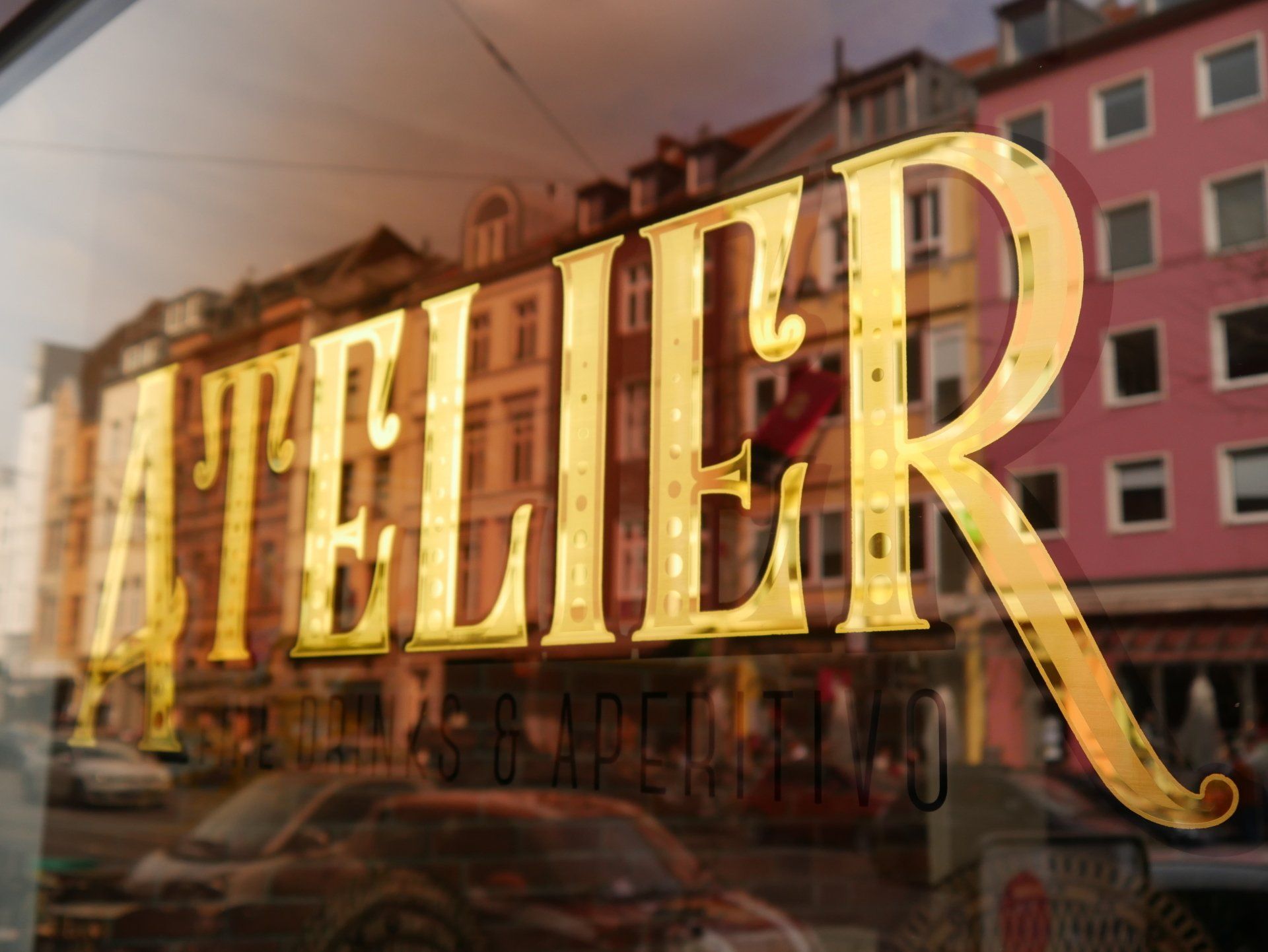 Vergoldung des Schaufensters in 24 Karat sowie eine Fassadenbeschriftung im Innenbereich verleihen dem "Atelier" den authentischen Charme französischer Lokale.