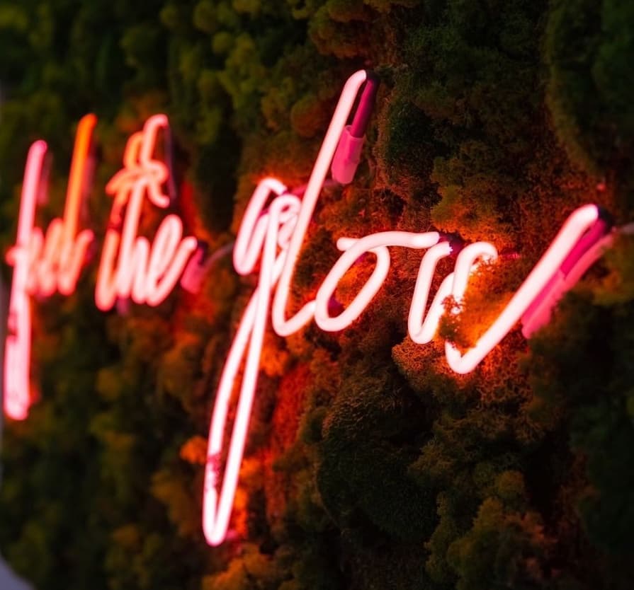 The interior is illuminated by a beautiful neon installation on a decorative moss wall.